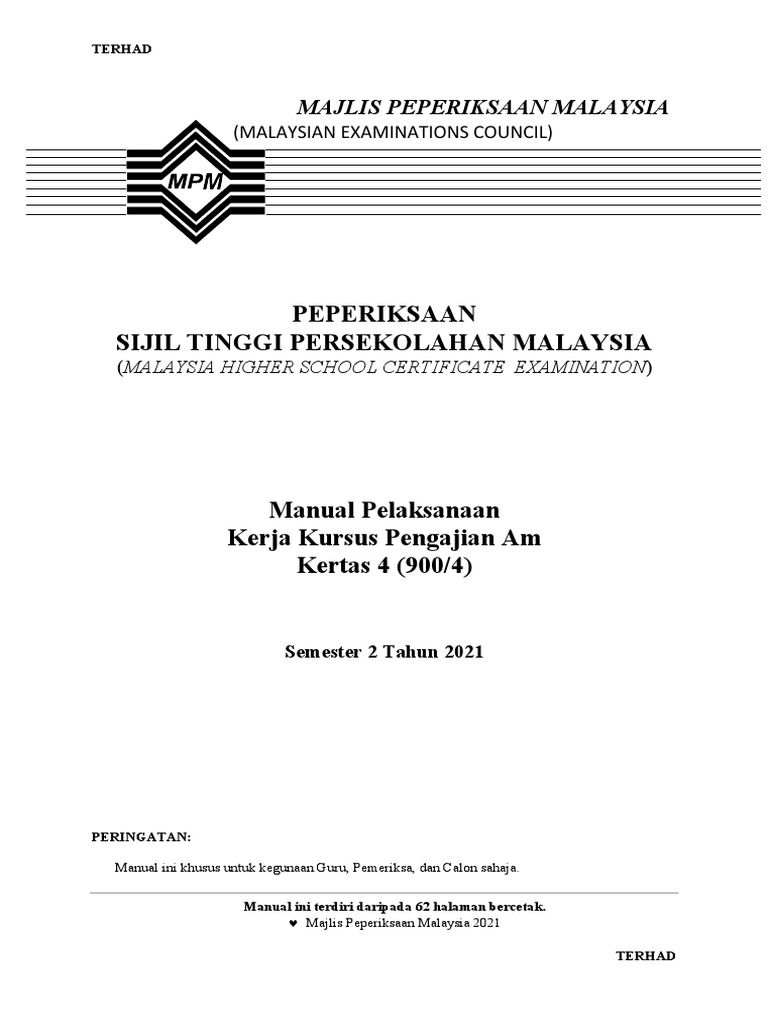 TERHAD MANUAL PELAKSANAAN KERJA KURSUS 3 1 PENGENALAN Setiap calon Sijil Tinggi Persekolahan Malaysia STPM wajib melaksanakan kerja kursus dalam mata pelajaran Bahasa Melayu. Jumaat 29 Oktober 2021 Hits. Manual ini adalah khas untuk kegunaan guru atau pemeriksa dan calon sahaja dan tidak boleh dikemukakan kepada pihak yang tidak.